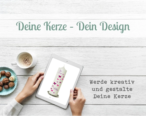 Mit unserem Design-Tool kannst Du eine Taufkerze oder Hochzeitskerze ganz nach Deinen Vorstellungen selbst designen und die Kerze mit Logo, Foto oder eigenem Design bedrucken lassen.