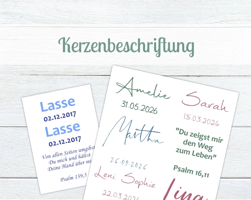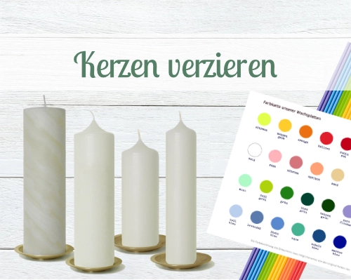 Neben Anlasskerzen jeder Art für Jungen, Mädchen und Hochzeitspaare bieten wir auch passende Kerzenteller, Kerzenhalter und Aufbewahrungsboxen für Deine Kerze an. Wenn Du Deine Kerze selbst mit Wachs verzieren möchtest, findest Du bei uns ein großes Sortiment an Bastelmaterial wie Kerzenrohlinge, Wachsplatten, Wachsstreifen und Verzierelementen aus Wachs. Um Deine Kerze dauerhaft schön zu beschriften, kannst Du Dir eine einfach anzubringende Kerzenbeschriftung von uns anfertigen lassen oder ein von Dir gestaltetes Kerzenmotiv auf eine spezielle Kerzenfolie drucken lassen. So ist das Selberbasteln Deiner Kerze kinderleicht! Wir stehen Dir dabei mit Tipps & Tricks zur Seite!