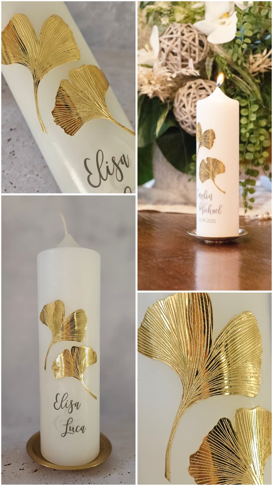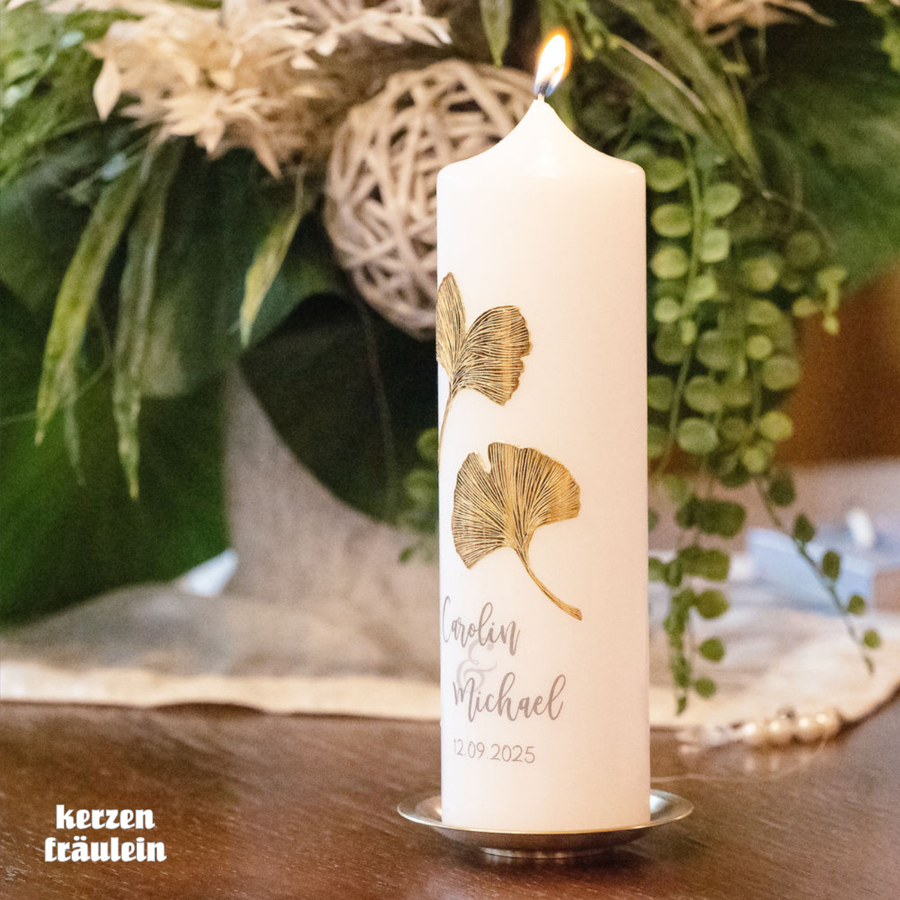 Die edle Hochzeitskerze ‚Ginkgo‘ ist klassisch, elegant und einfach wunderschön! Der aus Asien stammende Ginkgo ist seit über 200 Jahren in europäischen Gärten zu finden, seine zweigeteilten Blätter gelten als Symbol der Liebe und der Freundschaft.