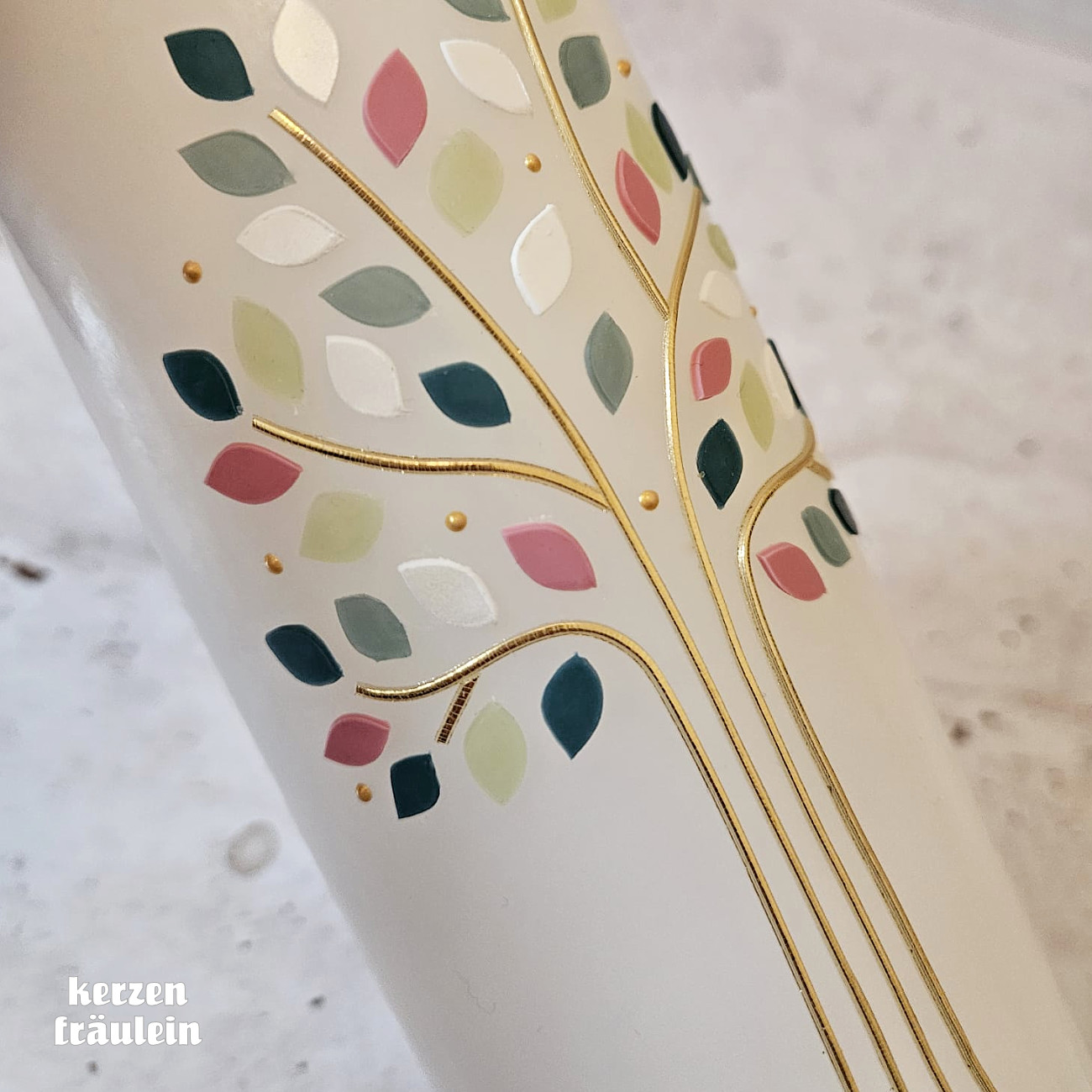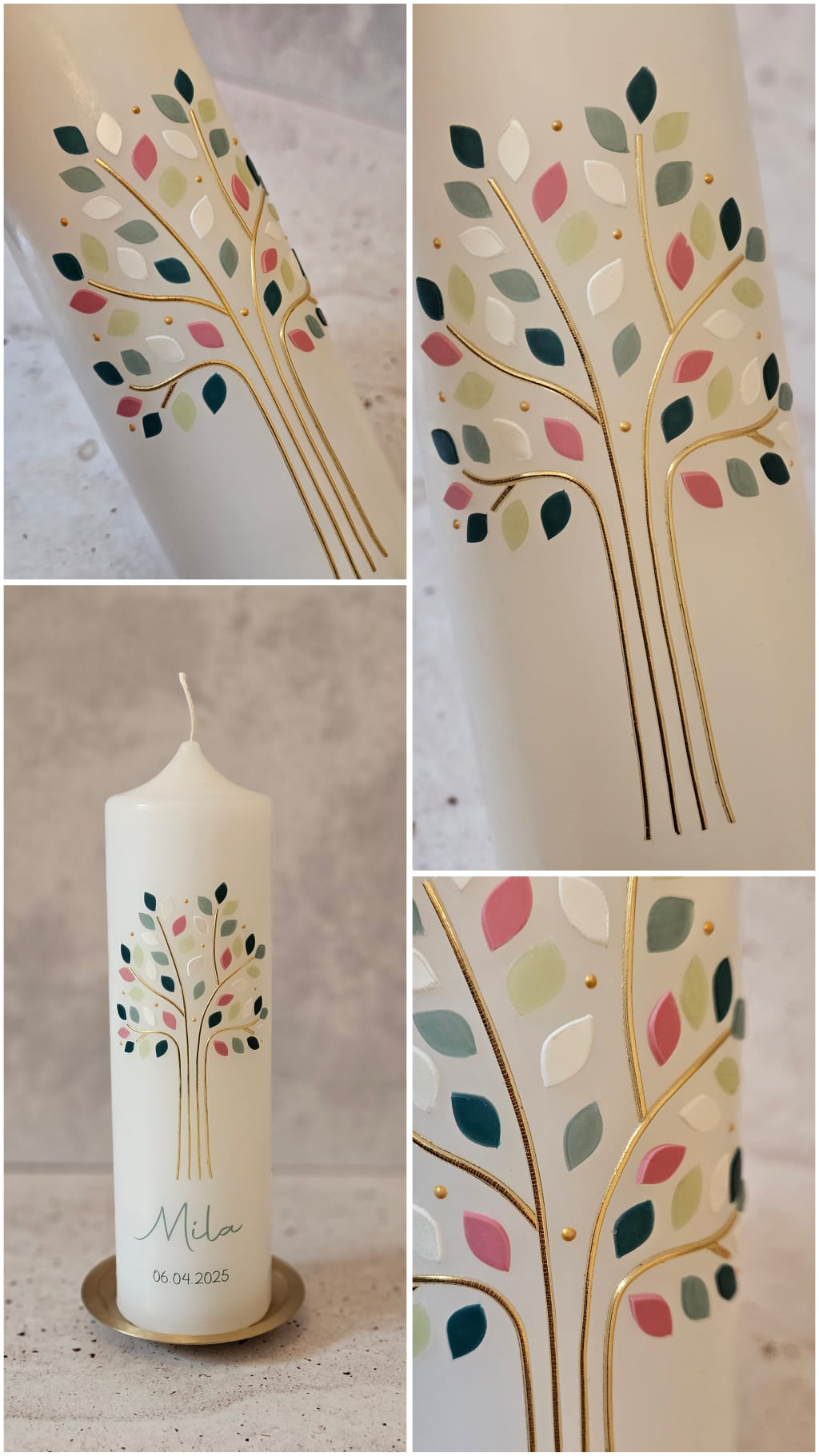Der zarte goldene Baum ist mit Blättern in den Farben Eukalyptus, Lindgrün, Blaugrün, Perlmuttweiß und Altrosa sowie kleinen goldfarbenen Tupfen verziert. Das Motiv ‚Lebensbaum Mila‘ eignet sich besonders gut als Taufkerze, aber auch als Kerze zu Kommunion und Konfirmation.